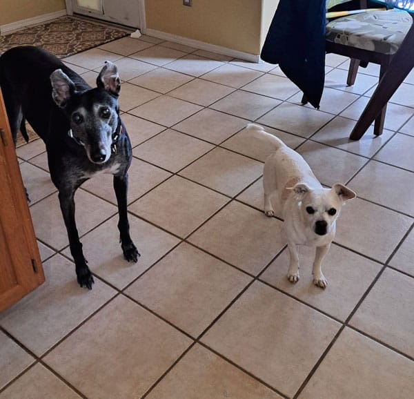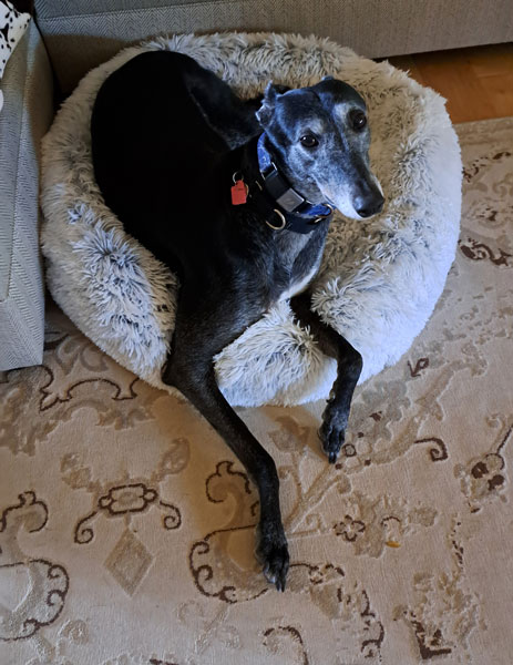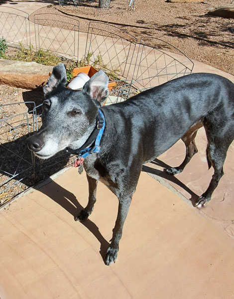 Tess is a spunky and affectionate gal, she was returned to GALT when her owner could no longer care for her. She presently shares her foster home with another senior Greyhound foster and a Pug/Jack Russell mix; her interaction with cats is unknown.
