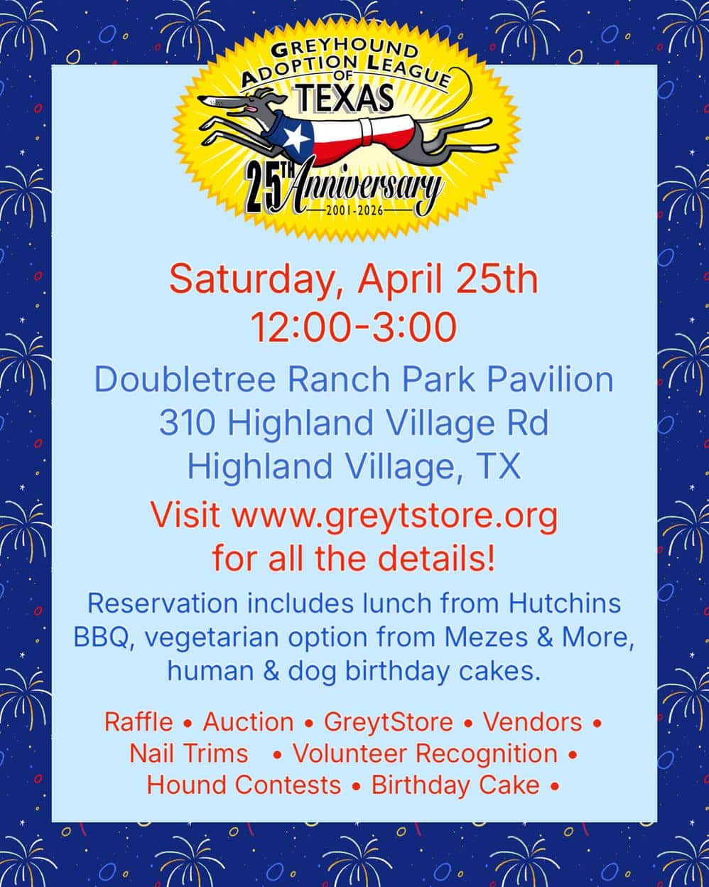 Tickets are now available for the party at the Doubletree Ranch Park Pavilion (310 Highland Village Rd, Highland Village, TX 75077) on Saturday, April 25th from 12:00-3:00.
