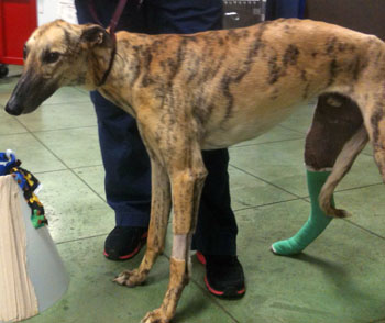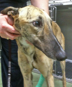 Lucky is a 1-year-old brindle male born April 21, 2011. His sire is Rhythmless and his dam is TMC's Jiffy. Lucky never made it to the track due to a broken right hind leg, which sadly had to be amputated. His adventures continued as his amputation site was injured during a car accident with his foster mom. However, his name still fits him as the x-rays after the accident showed a metal object that had been in his stomach for quite a while - thankfully, Dr. Gower and the excellent staff at CTVSH were able to remove it via endoscope. Lucky is certainly one handsome, and lucky, fellow!